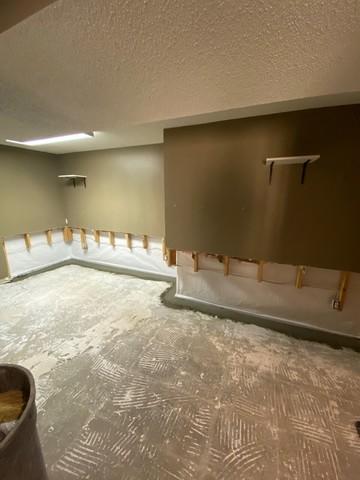 You can see the white tarp on the wall, this is our CleanSpace. It is collecting any water that is coming through cracks in the walls behind the drywall and sending down to our WaterGuard. Under the thin gray line is our drainage system, WaterGuard. The water is send from CleanSpace into the WaterGuard and sent to the sump pump. Water can also enter the WaterGuard if it comes through the cold joints.