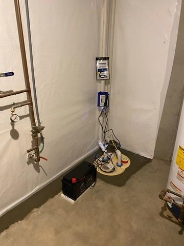 The kidney bean shape on the floor is one of our sump pumps. It is installed below the floor, so the WaterGuard can filter water into it and out of the home. There is a WaterWatch alarm on the top, the red hockey puck shape, that will alert you if the water level gets too high, along without back up battery incase of emergencies.